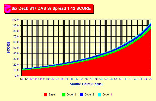 Here we see the SCOREs in a six-deck game for all penetrations from 26 to 130 cards behind the cut card. The top line displays the SCOREs assuming a full set of indexes. The cyan area represents the loss resulting from the use of rule #1 above (always stand on 16). The blue area is the additional loss caused by the #2 cover rules and the green area is the loss by also using the #3 rules. Therefore, the red area displays SCOREs using all three rules. Note: the losses from rule #2 would have been a bit lower with fewer indexes in use. Note: You can reduce the impact by merely changing the indexes of these plays to play them incorrectly in fewer situations.