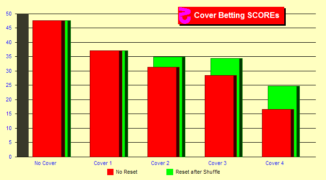 Cover Betting SCOREsBut what is the cost? Here we will look at the SCOREs for the same methods of cover in the previous topic to get a feel for the overall impact of the effects of betting cover. The green bars provide results assuming that you reset the bet to one unit after a shuffle. The red bars provide results if you follow the cover rules even after a shuffle. Reviewing the cover methods: