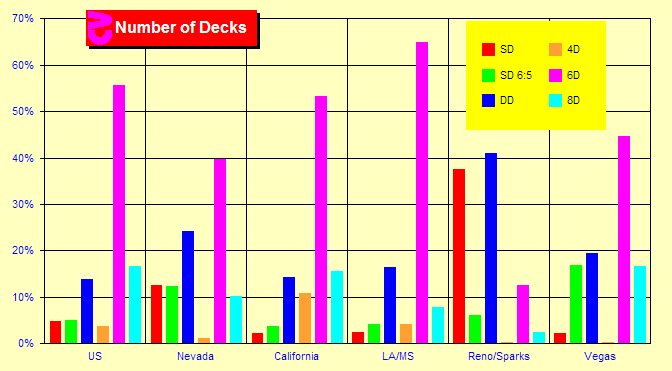 Let us divide up the data by a few areas of the country. The first six bars reflect the percentages for the entire U.S. and are the same as in the previous chart. The order of the bars is: single-deck, single-deck 6:5, double-deck, four decks, six decks, eight decks. Nevada, California, and Louisiana & Mississippi data are provided in the next three groups of bars. I have also included bars for Reno/Sparks and Las Vegas. Las Vegas in this section refers to the city, the area around The Strip and North Las Vegas, but not Henderson.