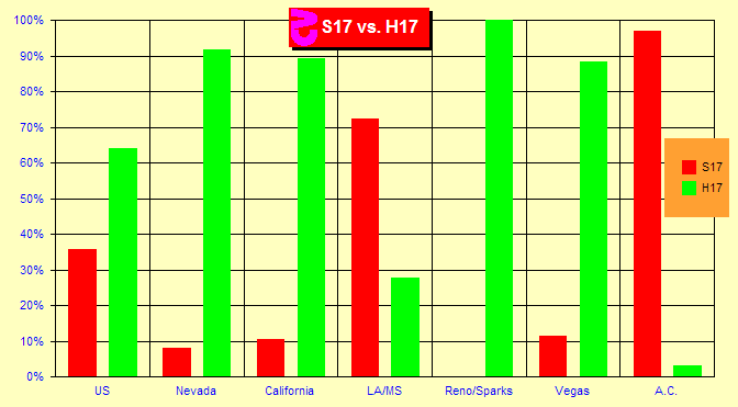 Breaking up Nevada, we see that Reno/Sparks is essentially 100% H17. This is not a surprise as Northern Nevada games are generally pitch games (one or two decks) and these games commonly include H17. Las Vegas is 88% H17. This is a shame and a substantial change from earlier days.