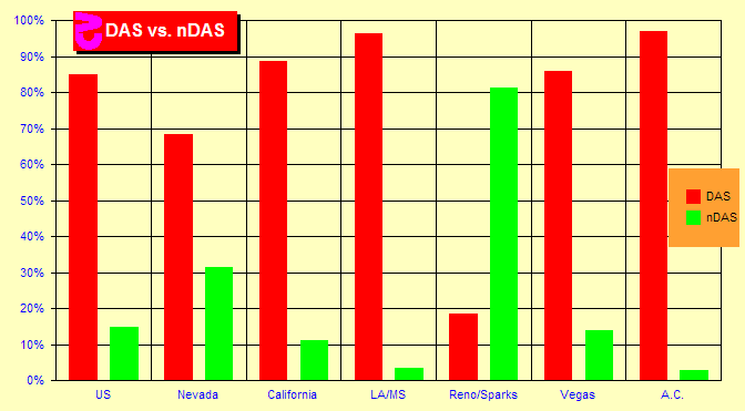 Double after SplitNext, we look at Double after Split in red and no DAS in green. DAS is not as important as S17, but still provides a significant difference to advantage. Better news here, as 85% of games in the U.S. are still DAS. This makes sense to the casinos, as most players do not play DAS correctly. Nevada sees a somewhat lower frequency of DAS, California just a bit higher than the U.S. average, and Louisiana & Mississippi higher still. This makes sense as DAS is most commonly found in shoe games. We see a far lower frequency of DAS in Reno/Sparks due to the large number of single-deck games. As with S17, Atlantic City is a bright spot with heavy DAS availability.