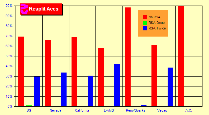 Resplit AcesMost casinos allow you to split aces only once. The situation does not come up that often as you must receive three aces, but it is more important than people generally think as an ace is a great hand and a 12 with no chance to hit is a terrible hand. In a six-deck game, Resplit aces reduces the basic strategy house edge by about .09%. We can see that 69% of U.S. games disallow RSA. An insignificant number of tables allow one resplit while the rest allow splitting up to four hands. Nevada, California, Louisiana and Mississippi do not vary greatly from the national average. However, in Reno and Sparks, the rule is nearly nonexistent. This is due to the odd fact that RSA is rarely seen in single-deck games. I say odd because the rule is not as valuable in single-deck games where you will rarely receive three of the four aces in one hand. We do not see this rule in Atlantic City.