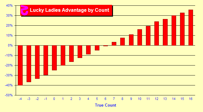 Now, let us look at the Lucky Ladies side bet using standard Hi-Lo as the card counting strategy. The chart below provides the advantage at each true count. First the good news. Although LL has an outrageous 25% house edge at a true count of zero, the advantage changes dramatically as the count changes. This chart plots the advantage by true count. We can see that the advantage turns positive at true count +7 and continues to increase substantially above that. So, if we make the side bet only with a true count of +7 or higher, we gain a theoretical advantage and “beat” the side bet. So far, so good.