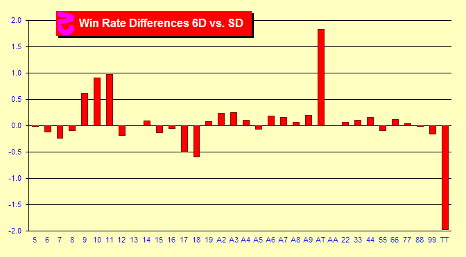 The differences between the win rates in six decks and single-deck look quite different from the differences in advantage. Wherever you see a bar pointing upward, that hand is responsible for more gain in single-deck than in six decks. Here we see that Blackjacks are more valuable in single-deck, because they occur at a slightly higher frequency and are less likely to tie with a dealer Blackjack in single-deck. All Pairs occur less often in single-deck than in six decks. This does not matter much for pairs of aces through nines, as they do not occur often. But pairs of Tens are very common. Therefore, we see that six-deck games enjoy substantially more gain from T,T since the frequency of those hands increases with six decks. Single-deck sees a higher win rate in hands 9, 10, and 11 because both the frequency and advantage are higher in single-deck.