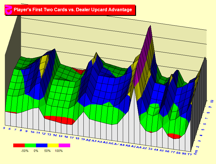 What are the good Blackjack hands? Now it gets more complicated. Here we see the same 340 hands. But instead of the frequency of each hand, we see the advantage of each hand. That is, average gain or loss if you get the hand. Green and red have a negative advantage. Blue, yellow and purple have increasing degrees of positive advantage. Obviously, Blackjack is the best hand. There is a gain of 150% except against an ace or ten where there is a bit of a downward slope. As you would expect, stiffs (12-16) are the worst hands and 17 is nearly as bad. But this chart also shows that the upcard is very important. You can see red areas on either side of the chart where the advantage falls below -50%. These are hands against a dealer ten or ace. And you will see a ridge down the center of the chart where the dealer upcard is a six. A dealer six is particularly good with player pairs. It is no surprise that 16 against ten and ace are the lowest valleys in the chart.