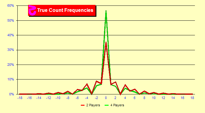 Single-deckNow let us look at single-deck. With only one deck, the number of players becomes very important and can dramatically affect the results. Here the green line depicts frequencies for four players with two rounds. The red line displays two players with four rounds. You will note that with four players a true count of zero is far more likely. Also note that there are no rounds at true counts of 3, 7, and 9. Due to the method we use to calculate true counts, some counts cannot exist in single-deck. When you sit at a single-deck game, be aware that the number of players substantially affects the game when counting cards.