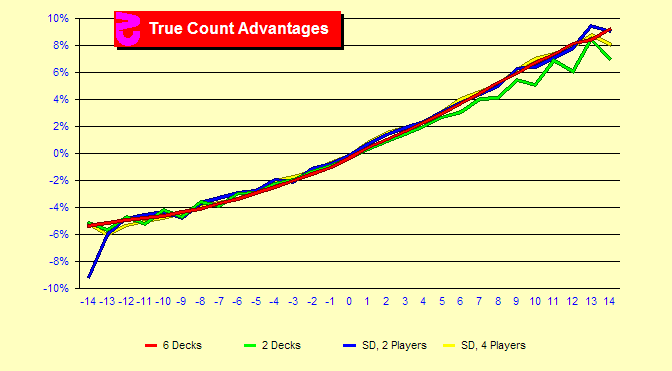 How valuable is each True Count? Here we will look at the advantage at each count. That is the percentage gain you can expect on average from the initial Blackjack bet. Data for six decks, two decks, and single-deck with two or four players are displayed. It can be seen that the number of decks does not have a large effect on the curve. If the rules were not adjusted by the casinos to provide about the same advantage for single-deck and shoes, the curves would separate, but would still have about the same shape. The upward trend appears fairly linear, but we will see that it is not. The angle of the curve is greater in the positive counts than in the negative counts. That is, the lines gently accelerate upwards. The advantages here are positive at counts of +1 and above and negative otherwise. But the +14 count is substantially more positive than the -14 count is negative. The lines tend to become jagged at the extremes because there are very few hands at these counts and the standard deviation is higher.