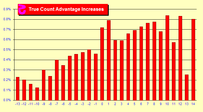What is the change in advantage from TC to TC? In this chart, the increase in the advantage at each count is displayed for six decks. For example, the bar at +1 shows that the advantage at a true count of +1 is .79% higher than the advantage at zero. The advantage at a true count of +2 is .6% higher than the advantage at +1. A common card counting rule of thumb is that the increase at each successive count is about .5%. As we can see, the rule of thumb is a very rough estimate. This is not surprising since the effects of indexes kick in at different counts. Full indexes (over 100) were used in this chart. With a smaller number of indexes, the gains in advantage would be less. Few areas of Blackjack maintain simple linear relationships. Insurance is the most notable exception.