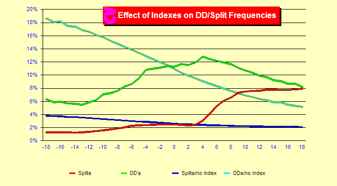 How is this affected by indexes? This chart looks very different. Here a comparison is made between full indexes (100+) and no indexes. Blackjacks and Insurance have been removed. The green line is the same as in the above chart, percentage of hands doubled with full indexes. The cyan line shows the hands doubled when there are no indexes. The lines are completely different. Without indexes the cyan line starts very high and drops substantially as the count increases. This is because there are many low cards available at low counts, both for the dealer's upcard and for your own hand, allowing many doubles. As the count increases low cards are less common. But many of these doubles are a mistake at low counts since you will probably also draw a low card and the dealer will probably not bust. So the indexes save you from doubling when you shouldn't at low counts. The green and cyan lines cross at about true count zero. Here there are fewer low cards making fewer of the more common doubles available. But more indexes have been reached identifying more opportunities. These opportunities, like 9v7 are now available because the large number of high cards increases the likelihood that you will win the hand. Splits displayed in red for 100+ indexes and blue for no indexes behave in much the same manner. However, keep in mind that the very large-magnitude true counts are rare and we should not be playing at the very low true counts.