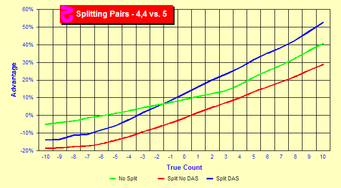 This chart provides an example of an index affected by rule change. Normally we do not split 4s against a dealer 5. But with the Double after Split rule, we do. The green line is the advantage with no splitting. As the count increases, the green line slopes upward giving us a very nice advantage at higher counts where the dealer is more likely to bust. The red line displays advantages for splitting the 4s with no DAS. This line also increases as the count rises. But it does not rise quickly enough to cross the green line. So, we never split. On the other hand the blue line adds the extra advantage due to the possibility of doubling after a split. The blue line does cross the green line indicating that the split is advantageous above the cross point.