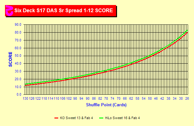 Let us take a quick look at an unbalanced strategy against a balanced strategy. Here K-O and Hi-Lo are compared. Hi-Lo has a slightly better SCORE than K-O here primarily because it was simmed with more indexes. But the point of the chart is that the performance of unbalanced (e.g., K-O) and balanced strategies (e.g., Hi-Lo) have very similar patterns even though the previous pages showed that their counts and advantages at different depths act very differently. These strategies work somewhat differently — but in the long run their performance characteristics are very similar .