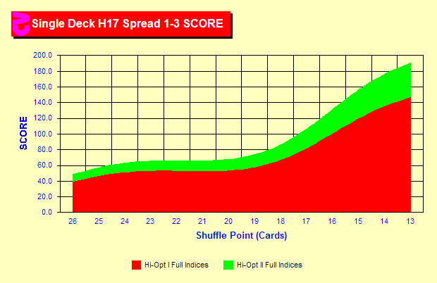 Single-deckThe story with single-deck is a bit different. Here Hi-Opt I and Hi-Opt II are compared. These are level I and II strategies tuned for single-deck. Full indexes are used as indexes are more important in single-deck as we have seen previously. The difference here is more impressive as there is a clear gain in using a more complex strategy in single-deck games.