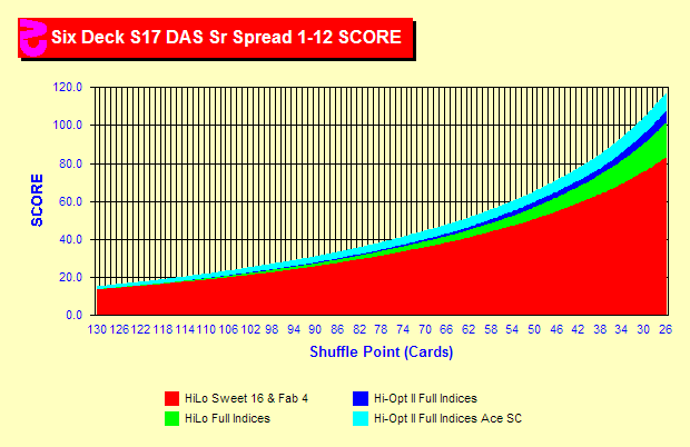 www.qfit.com/book/z80Chart.gif In this chart we see a shoe game with Hi-Lo, a level I strategy, in red using only 20 indexes. Green displays the gain from using full indexes. The blue area is the gain switching to Hi-Opt II, an ace-neutral strategy not advised for shoes. Some people believe that ace-neutral strategies are no good for shoes. As we can see, Hi-Opt II works well. But the gain over a level I strategy is minimal. In fact almost no gain is realized at normal penetrations. Now let’s add an ace side count. The cyan area shows a further increase due solely to the side count. The blue and cyan areas together are the gain from moving to a level II, ace-neutral strategy with a side count.