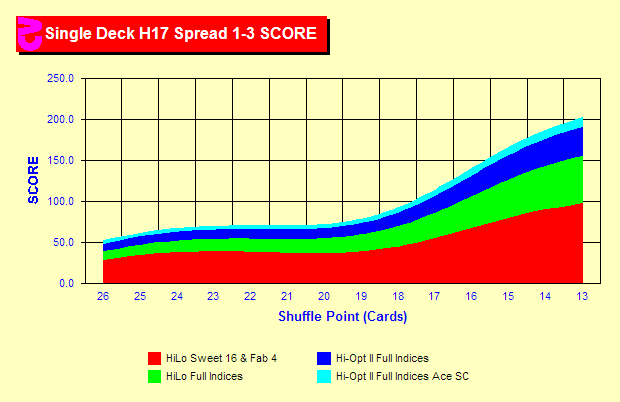 ·          Single-deck, H17, 3 players, HiOpt II, truncate, max indexes, quarter-deck resolution, penetrations from 13-26 cards cutoff by the card