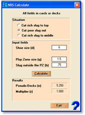 1.5 decks. NRS scales up the count and the pseudo decks to compromise between 1˝ decks and 6 decks. In this case, scaling up by 77%. A running count of -8.5 times 1.77 is -15 and 1.5 decks times 1.77 is 2.65 decks. So, we have a compromise of a starting count of +15 (-1.5 times the TZ) and 2.65 pseudo decks. In this manner, the true count at the start of the PZ is the same as it would be without scaling up the pseudo-decks; but the calculation into the PZ is more conservative. Cut Poor Slug Out