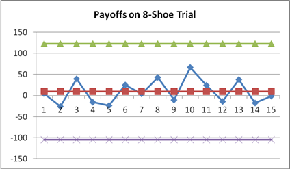 On Figure 12.4, the top green line is the UCL, the bottom violet line is the LCL and the red line is X-Avg . We can clearly see that there are no values outside the X-chart limits. We don’t have to guess. It is very visible. And it is to be expected because we are dealing with computer-perfect play. In other words, under the controlled conditions, there is no abnormal variation. The limits let us know that under the specified conditions, we should never have a win exceeding 122.80 units. If we do have an win that exceeds 122.80 units over an 8-shoe Trial, then there is definite reason to suspect a “special cause.”