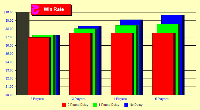 Win Rates This chart illustrates the same scenario, but provides win rate per hand data instead of percentage of rounds. Although we play fewer hands when the BP takes longer to reach the table, the amount won per hand increases. This is because the count may increase, but if it decreases, the BP is waved off. Now if we only had one spotter, we would lose money if the BP takes too long to arrive. But with multiple spotters, we may actually gain slightly if the BP makes his way to the table in a more leisurely manner.