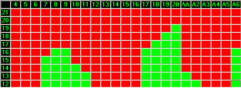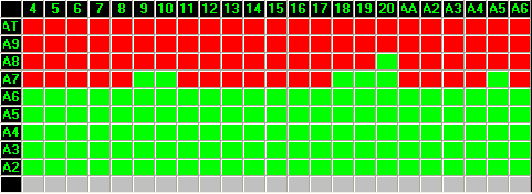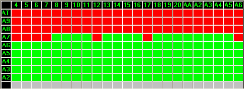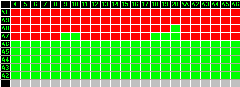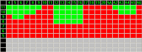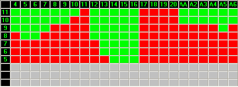 Below is a six deck sample compromise strategy designed to make it less obvious that you are hole-carding. The advantage is 9.6% if you always win Insurance and 7.2% if you never take Insurance. However, a full compromise strategy would require two sets of tables - one for a high dealer upcard and one for a low dealer upcard.