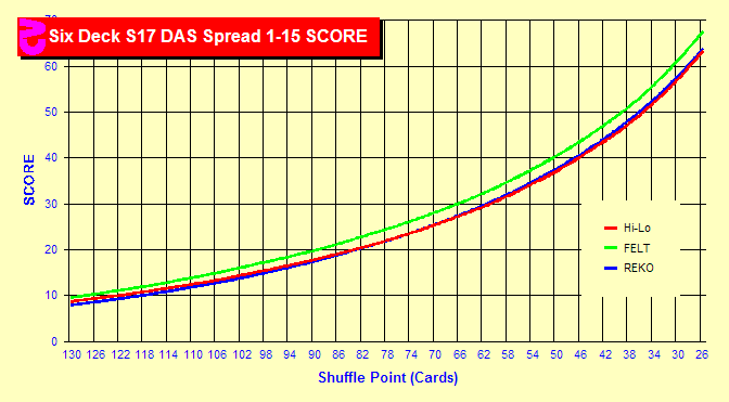 At the far right of this chart, we see the SCOREs for the three systems with 26 cards cut off. That is, 5½ decks dealt out of 6 (often referred to as 5.5/6). At the far left, 130 cards are cut off, or 3½ decks dealt out of 6 (3.5/6). At the deepest penetration, all strategies perform over six times as well as at the shallowest penetration. We can also see that the curves accelerate upwards towards the right. Every extra card of penetration is valuable. The red line displays the SCOREs for Hi-Lo, the standard. REKO performance is depicted by the blue line. We see that at poor penetrations, Hi-Lo performs better. At deep penetrations, REKO performs better. Here we see an example of how looking at only one penetration can affect the results of strategy comparisons. If we wanted to suggest that Hi-Lo was superior, we could pick one penetration or we could pick a different penetration and claim REKO was superior. Overall, REKO and Hi-Lo perform about the same. Of course, REKO does not require the skills of remaining deck estimation, true count calculation, and memorization of different indexes. FELT is depicted by the green line and performs about 7% to 12% better than Hi-Lo depending on penetration. Although FELT has simplified indexes (only two values), it does require the same skills as Hi-Lo and is a level II strategy, adding to complexity.