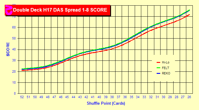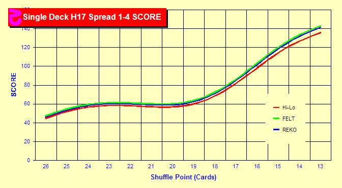 Double-Deck & Single-Deck Below we see the same type of charts, but comparing the three strategies in double-deck and single-deck games. In the first chart, the double-deck comparison shows REKO outperforming Hi-Lo by 4% to 5% and FELT outperforming by 6% to 8%. The single-deck comparison at the bottom shows FELT and REKO slightly outperforming Hi-Lo. REKO performs 3% to 4% better in the simmed games, and FELT 5% to 6% better. Alas, there are few good single-deck games still in existence.