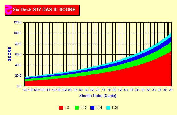 Bet SpreadsBet spread is the ratio of your smallest bet to your largest bet. The higher the ratio of bets when you have an advantage to bets when you have a disadvantage, the better your results. Unfortunately, the higher the ratio, the more you look like a card counter. So, we need to pick a compromise spread. First, we need to know just how much bet spreads affect results. For this, I will present charts, as they allow quick comparison of many points of data at once. In the chart below, red indicates the SCORE using a bet spread of 1-8 (e.g., $10 to $80). Green, blue, and cyan successively add four to the previous spread. The effect is much like adding indexes. But bet spread adds to your SCORE at every penetration while extra indexes are far more important at the higher penetrations depicted at the right of the chart. It should also be noticed that there are diminishing gains as each addition has less of an impact than the previous. Of course, it is much easier to add to the spread than to learn and use more indexes. On the other hand, the house is unlikely to notice that you are using more indexes, but is very likely to notice a large spread — particularly at higher betting levels.