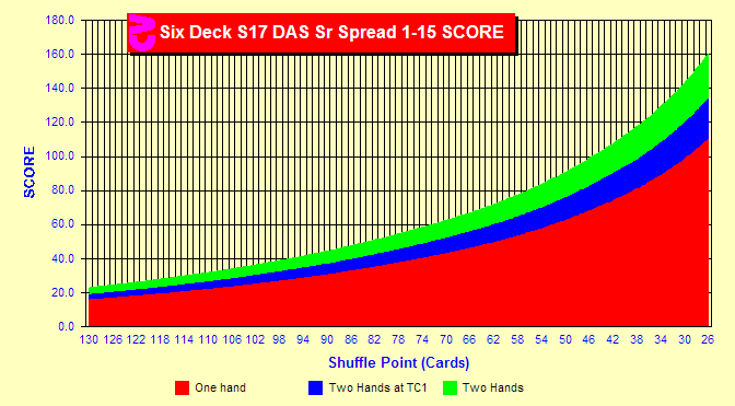 This chart is based purely on the overall SCORE of always playing one hand, always playing two hands or switching between one and two hands. What we see is a higher SCORE when always playing two hands. This is due to the fact that playing two hands allows a higher betting level without increasing risk of ruin. The consensus at this time is that always playing two hands is superior to playing one hand, especially when you are not alone at the table.
