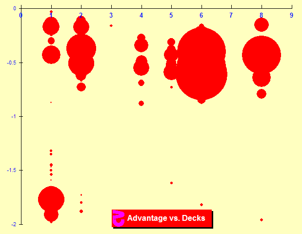 Advantage Bubble Chart One quite different chart is provided here. This is a bubble chart of basic strategy advantage versus the number of decks. The x-axis is the number of decks from one to eight. The y-axis is the advantage from 0 to -2%. The size of the circles is based on the number of tables that exist. For example, there are 1,015 six-deck tables with an advantage of -.61% Therefore a very large circle is placed in the six-deck column for -.61%. All tables in the U.S. are placed in circles on the chart in this manner. What we see is a very large number of tables concentrated in the six-deck column with advantages of -.3% to -.62%. In the single-deck column, we see a large concentration at the lower left indicating a very poor advantage. These are the 6:5 Blackjack tables. There are some dots above and below these games since the other rules vary. The 3:2 Blackjack single-deck games are in the upper left with far better advantages. We also see a few very poor games with more decks. Most of these are also 6:5 Blackjack. A few promotional games with positive edge were removed.