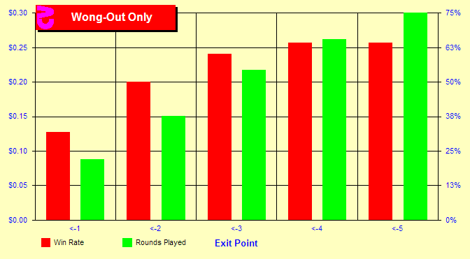 Exit Point Only Finally, we look at entering the shoe for the first hand after the shuffle, and leaving if the count drops too low. Here we are not back-counting. We simply skip out if the advantage turns significantly against us. Either we look for another table, or take a bathroom break and return to the same table. (Note: Returning to a table in the middle of a shoe without Back-Counting means that we do not know the count. We could start counting from the middle, but you must assume that all the unseen cards are still in the shoe instead of the discard tray for the purposes of calculating the true count, and penetration for that shoe will be very poor.) We see that the green bars increase far more quickly than the red bars. If we leave with a count below -5 instead of -4, we will play a higher percentage of the hands, but with no gain. Note: The spread is 1-10 in this chart. The 1-4 spread in the other charts is not adequate if you start play at the shuffle.