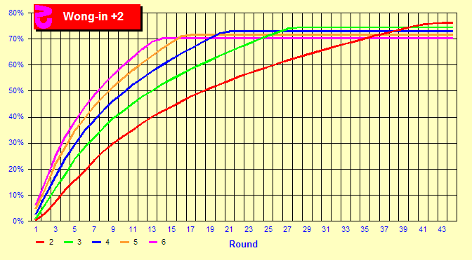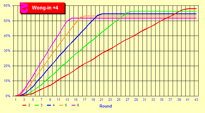 Back-Count Round So, when does a back-counter get to sit down? This chart shows the percentage of times that a back-counter who enters at +2 and stays until the end of the shoe will be seated in each round for two to six players including the counter. So, looking at the magenta line for six players, the player will be seated 71% of the time in round 44, but only 7% of the time in round 1. (The chart starts at round 0, where the counter can never enter.) The second chart is the same except the back-counter sits at a count of +4.