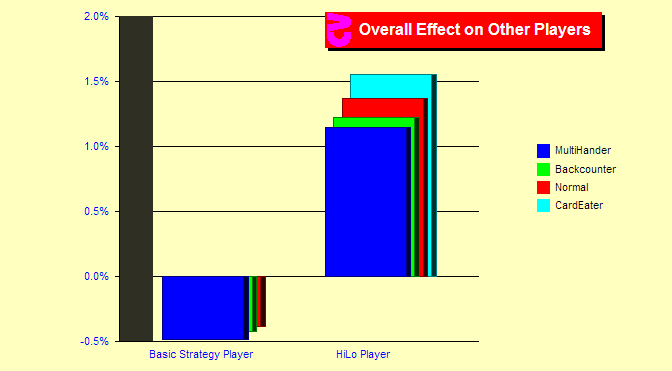 What are the overall effects? Here we summarize the overall effects for the last several pages. Red shows the normal advantage for a Basic Strategy player and a Hi-Lo card counter. Overall advantages are also displayed for the situations defined on these pages. I did not bother with the Basic Strategy effect of a card eater as this really isn’t a realistic situation. The Basic Strategy bars all point downward since BS advantage is negative. We can see that the effect on the card counter is greater. But everyone is affected.