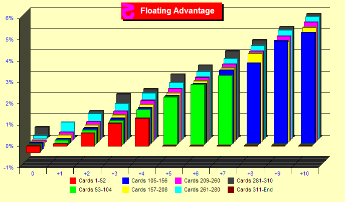 What is the Floating Advantage effect? Floating Advantage is an interesting quirk in card counting that has been examined by many Blackjack experts over the last few decades. We know that higher true counts have higher advantages for the player. Intuitively we would think that a specific true count always has the same advantage. But it turns out that the advantage of a true count increases as we travel more deeply into the shoe. In this chart we display advantages for true counts from TC 0 to TC +10. But we also provide these values by shoe depth. The Red bars show the advantage of true counts 0 to +4 in the first deck. True counts above +4 don't exist in the first deck because the running count never gets high enough to divide by the five remaining decks to reach these true counts. (We saw this earlier in the discussion on count ranges.) We see that the advantage starts out negative at TC 0 and increases for each count. The green bars show the second deck in the shoe, etc. Look at the bars at true count +3. The green bar is taller than the red bar, the blue taller than the green, yellow taller than the blue, etc. The deeper we travel, the more this true count is worth. The definitive article on Floating Advantage can be found in Don Schlesinger’s Blackjack Attack.