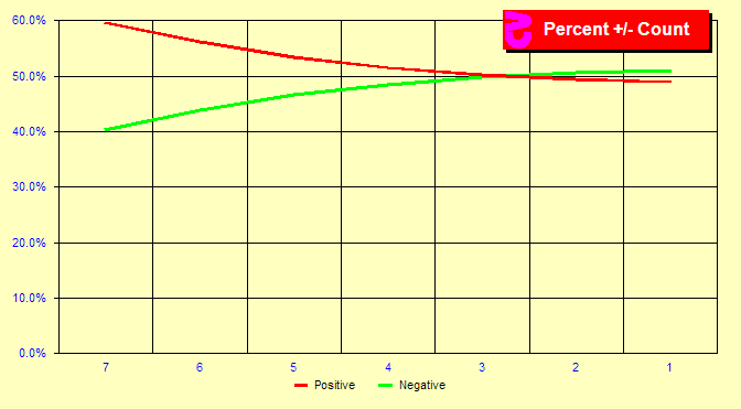 What are the percentages? It is difficult to see the differences in larger magnitude counts in the previous chart. To get a better look at these counts, let us take the exact same data but create a percentage chart. In this chart, we see that 60% of true counts of magnitude 7 are positive and 40% negative. Substantially more high positive counts exist than low negative counts of the same magnitude. But then, few counts of that large a magnitude occur at all. On the other hand, somewhat more counts of -1 and -2 occur than +1 and +2.
