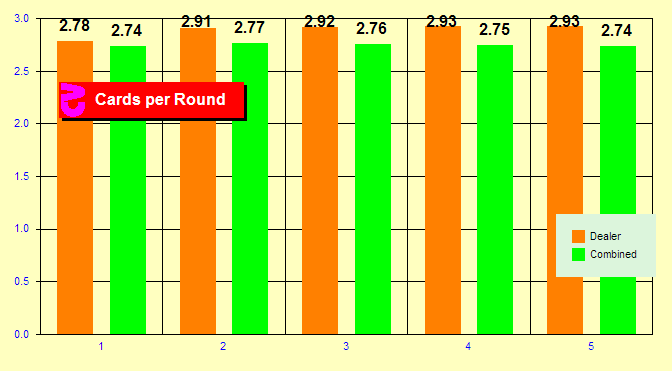 How many cards are dealt per hand? The books tell us that the average hand in Blackjack (including the dealer hands) contains about 2.7 cards. I thought I would look at this a bit further. We always temper this estimate by saying that the number of players can affect the average. So, I first looked at the effect of number of players. This chart shows the number of cards used by the dealer for 1 to 5 players in orange (six decks, H17, nDAS, Basic Strategy). With one player, the dealer averages 2.78 cards per round. This increases to 2.91 cards per round with two players. This is because the dealer does not need to finish his hand if the players all bust or receive a Blackjack, and the more players there are the less likely this will occur. As additional players are added, the cards used by the dealer continue to increase — but nearly the entire increase is seen going from one player to two players. The cards used by the player is about 2.71 per round. The players use fewer cards, even though the player can split, because the dealer hits all stiffs. And unfortunately there are a lot of stiffs. The green bars display the overall cards per person (dealer and player) per round. This changes less by number of players than one might think. This is because the cards per round increases from one to two players because of the increase in dealer cards, but then decreases as additional players are added and the lower number of cards used by players brings down the overall average.