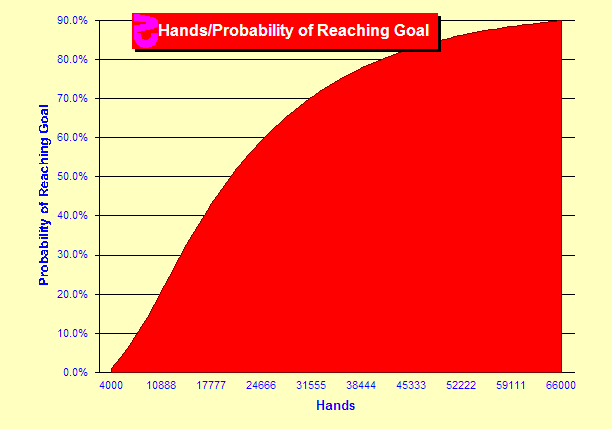 How many hands will it take? So how many hands must we play? In this chart we still have a goal of 2,000 units, but we fix the bankroll at 1,000 units and look at the probability of reaching the goal at various numbers of hands. At 4,000 hands we have a tiny chance. At 10,000 hands we have a 20% chance of doubling our bankroll, which matches the above chart. The probabilities grow quickly as the time increases and starts leveling off above 30,000 hands. We reach a 90% chance at 66,000 hands.