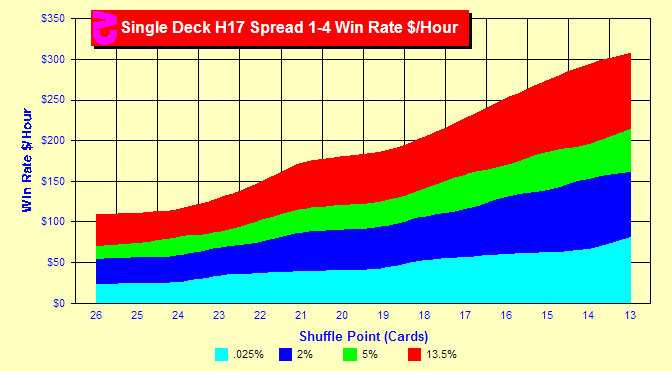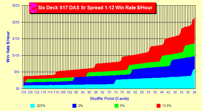 How does changing risk affect win rate? Before we determine the amounts that we will bet, we have to decide the level of risk that we are willing to accept. Obviously the lower the risk, the lower our returns. This chart displays our win rate given four possible risks of ruin: 13.5%, 5%, 2%, and .025%. That is, we are setting bets such that our risk of losing our entire bankroll varies from 13.5% to .025%. All penetrations are displayed from 26 to 130 cards cut off. Win rate is calculated in dollars per hour with a $25,000 bankroll, a bet spread of 1-12, 100 hands per hour, and optimal betting. The jagged movement is caused by the fact that a minimum chip size of $5 is used and the increased penetration allows increases in the minimum bet in $5 increments. The good news is that a dramatic decrease in our risk of ruin from 13.5% to 2% causes a much less dramatic loss in win rate. A drop in risk from 2% to .025% causes less than a 50% drop in win rate. (For the mathematicians, these risk rates roughly correspond to full Kelly, two-thirds Kelly, one-half Kelly and one-quarter Kelly.)