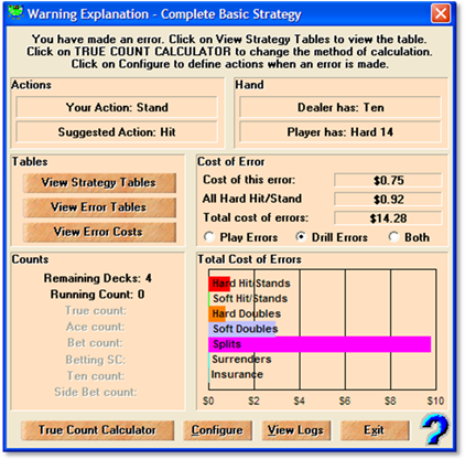 You can also view summaries of your errors and costs to identify your problem areas. All errors are also logged and can be displayed by clicking on View Logs, or History, View Logs from the Casino Vérité main menu. And your scores are charted over time. If your accuracy is good, pump up the speed. If your accuracy is poor, you can select the Drill Errors option and the drill will concentrate on your problem areas. You can also set the Drill & Play Errors option and you will be drilled on errors made both in the drill and playing the game. Refer to the Casino Vérité manual for information on additional options. Only the Flashcard drills are used for the study of Basic Strategy. The remaining drills are reserved for more advanced strategies.