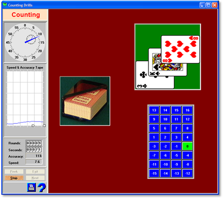 Running Count DrillsNext, we try the Running Count Drills. These drills are the same as the Quick Counting Drills, except that you will be tested as the cards are dealt. Select Running Count and a resolution of 8 cards. Approximately every 8 cards you will be asked for the running count. At the end, you will receive a score based on speed and accuracy. These scores are kept, and separate charts can be displayed for each drill to measure your progress. Two speed controls are used in these drills, deal speed and test speed. The first controls the speed at which the cards are flashed. The second controls the time available to respond to the tests. Note: On the main Drills screen, you will find a General Options button. Click to change several overall drill options including four methods of responding to tests. There exist many more Counting Drills, but these are for advanced techniques not used by REKO.